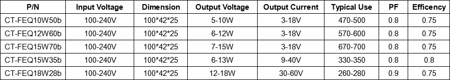 | Output | 10W 3-18V 500mA or 15W 3-40V 350mA or 12W 3-18V 600mA or 15W 3-18V 700mA or 18W 30-60V 280mA |