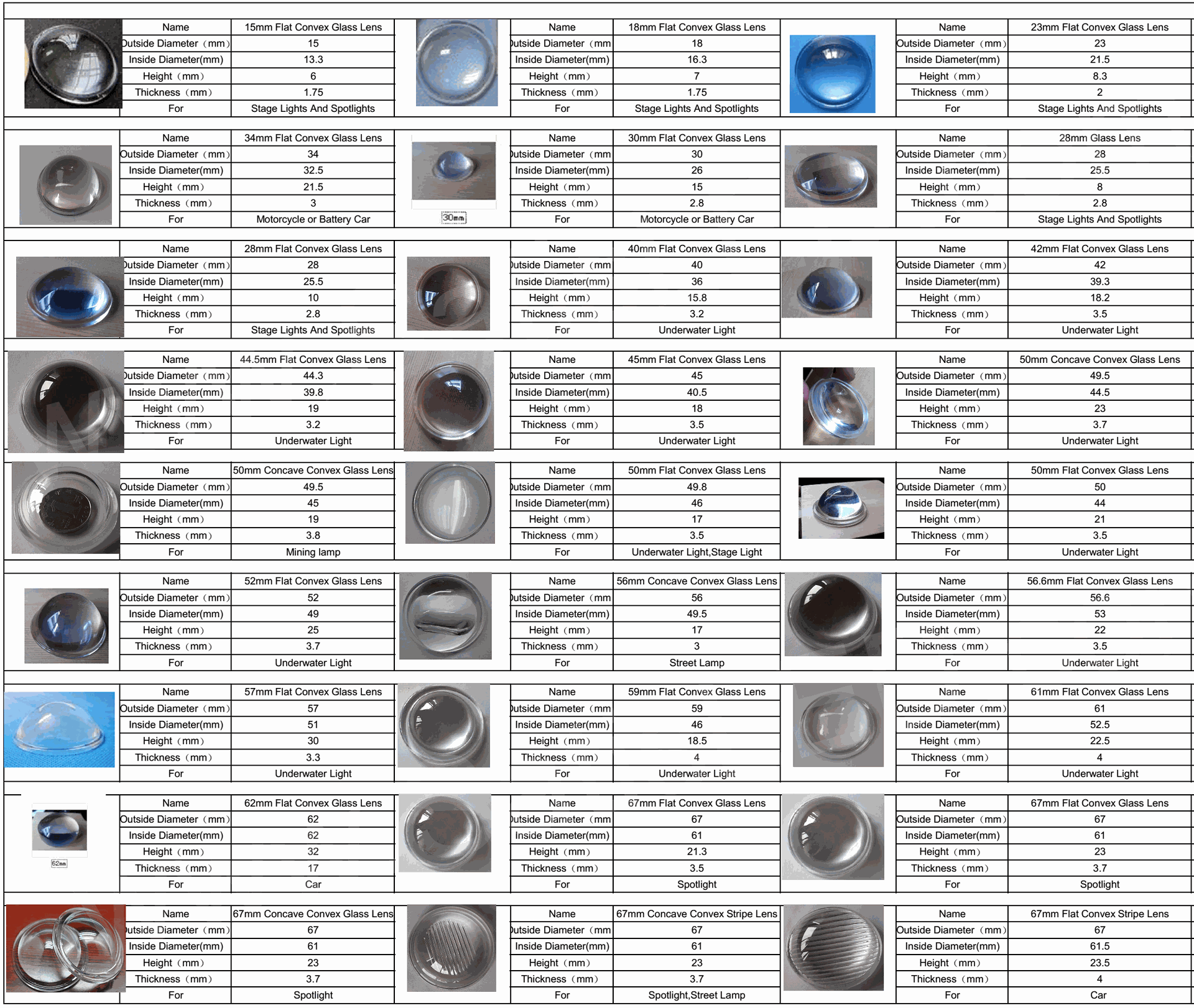 Diameter 15mm or 18mm or 23mm or 28mm or 28mm Flat Convex or 30mm or 34mm or 40mm or 42mm or 44.5mm or 45mm or 49.5mm or 49.8mm or 50mm or 52mm or 56mm or 56.6mm or 57mm or 59mm or 61mm or 62mm or 67mm Concave Convex or 67mm Concave Convex Stripe Lens or 67mm Flat Convex or 70mm or 73mm or 77mm or 78mm or 85mm or 86mm or 92mm or 100mm or 100mm Concave Convex or 105mm or 107mm