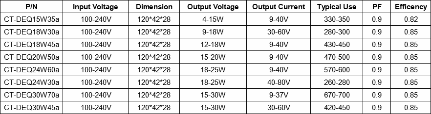 | Output | 15W 9-40V 350mA or 18W 9-40V 450mA or 18W 30-60V 300mA or 20W 9-40V 500mA or 24W 40-80V 280mA or 24W 9-40V 600mA or 30W 9-37V 700mA or 30W 30-60V 450mA |