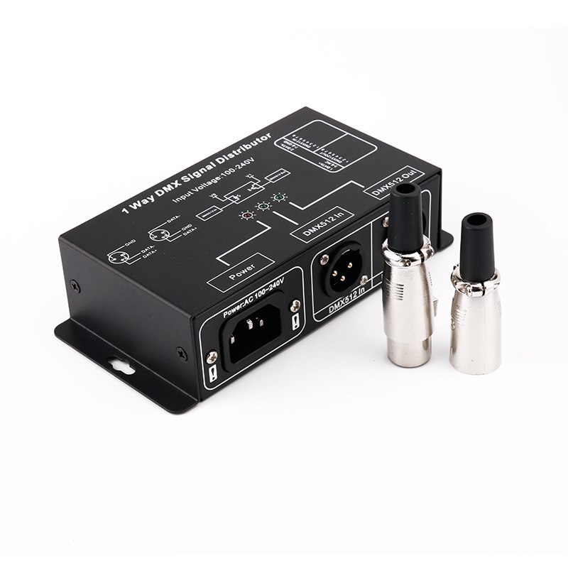 DMX121 signal distributor is one of DMX signaldistributor series, isspecially used for amplifying DMX512 digital lighting control signal. Theinput/output interface adopts high voltage isolation technology, applied toamplify DMX512 signal transmission in the short distance, as well as the using occasionwhere output/input interfaces need to be complete electrical isolation. Due tothe independent isolation between input/output interface, it can avoid burningprecision digital light console by the problem of the controlling circuit,decoder, computer light, silicon box and so on, to ensure the safe operation ofdigital lighting control, and also ensure DMX signal can normal transfer to allkinds of lighting equipment, so as to improve reliability for the whole digitallighting control system.