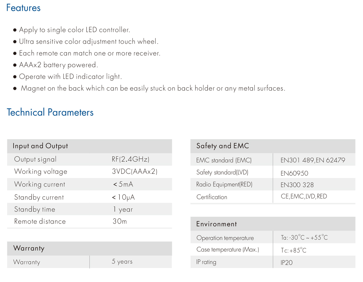 RT2 DC3V RF2.4G Color Temperature 1 Zone Remote Control