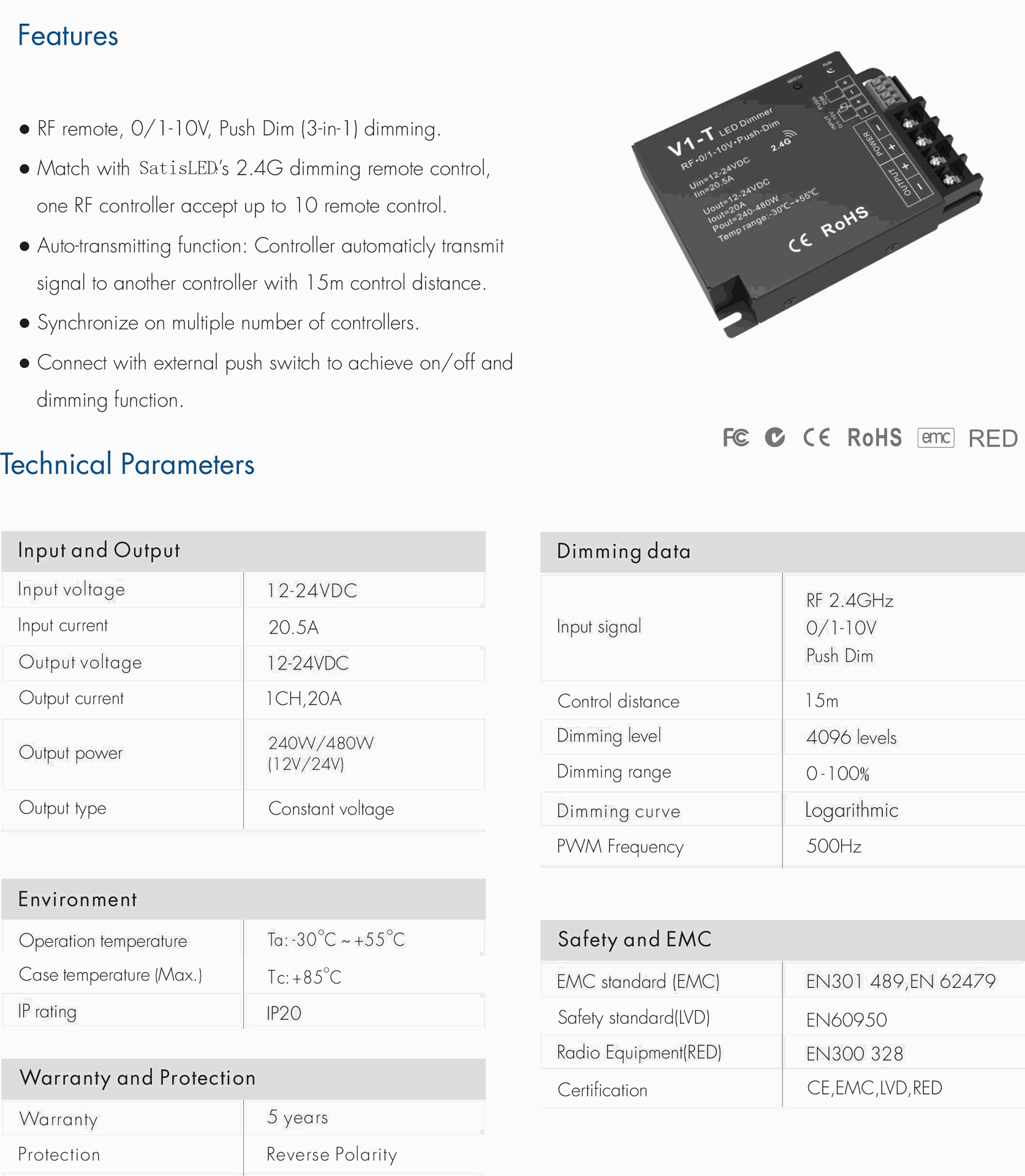 V1-T DC12-24V 1 Channel RF2.4G 0/1-10V Push Dim PWM CV Controller
