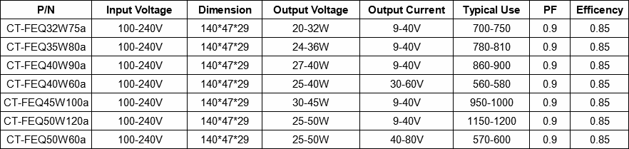 | Output | 40W 30-60V 580mA or 35W 9-40V 800mA or 32W 9-40V 750mA or 40W 9-40V 900mA or 45W 9-40V 1A or 50W 40-80V 600mA or 50W 9-40V 1.2A |