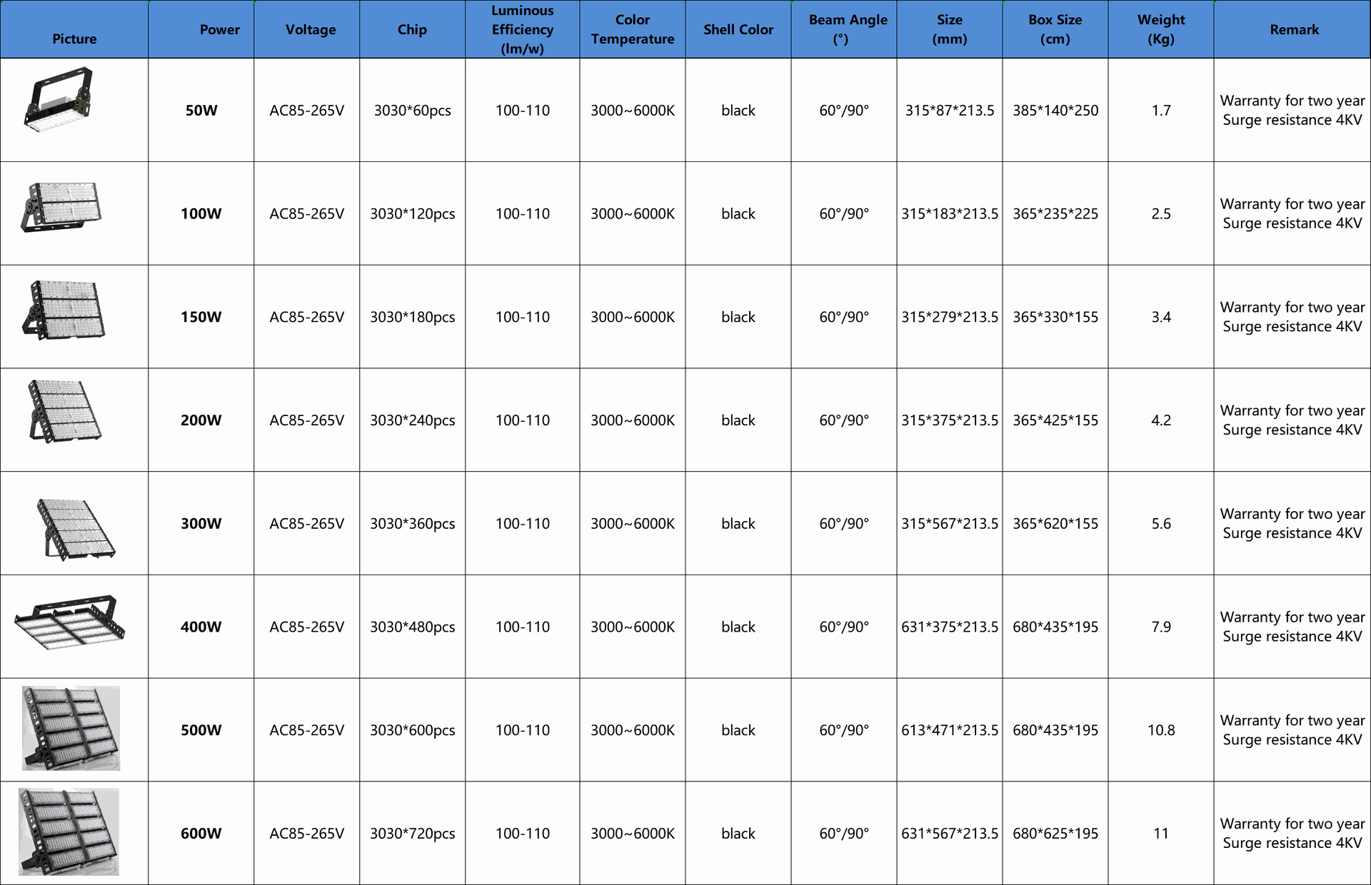 | Wattage | 50W or 100W or 150W or 200W or 300W or 400W or 500W or 600W |