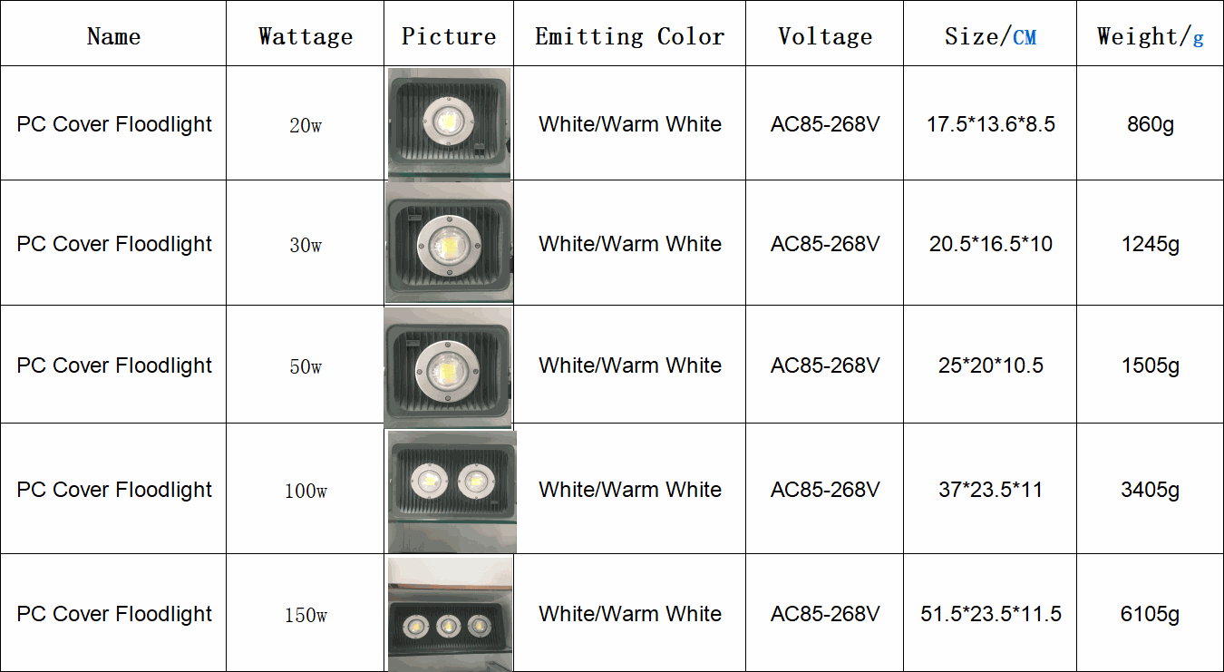 PC Cover LED Floodlight 20W 30W 50W 100W 150W Waterproof Lighting AC 85V-268V