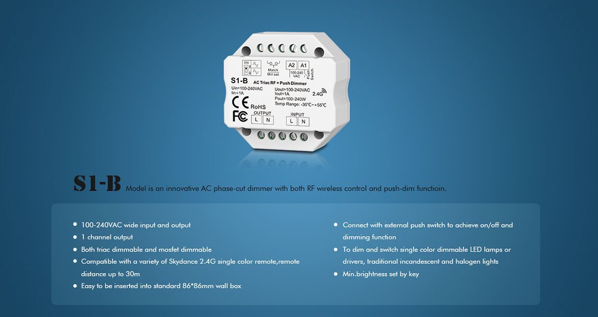 RF + Push AC phase-cut dimmer, 1 channel output.