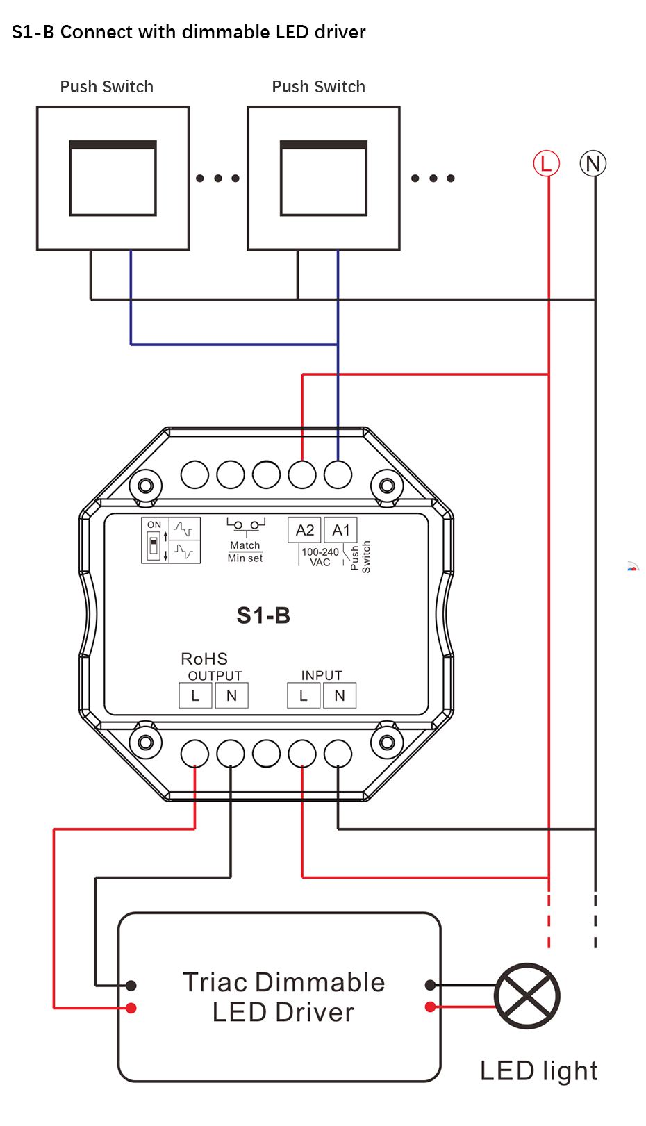 Connect with external push switch to achieve on/off and dimming function
